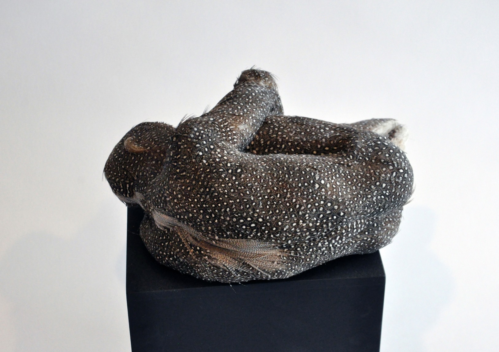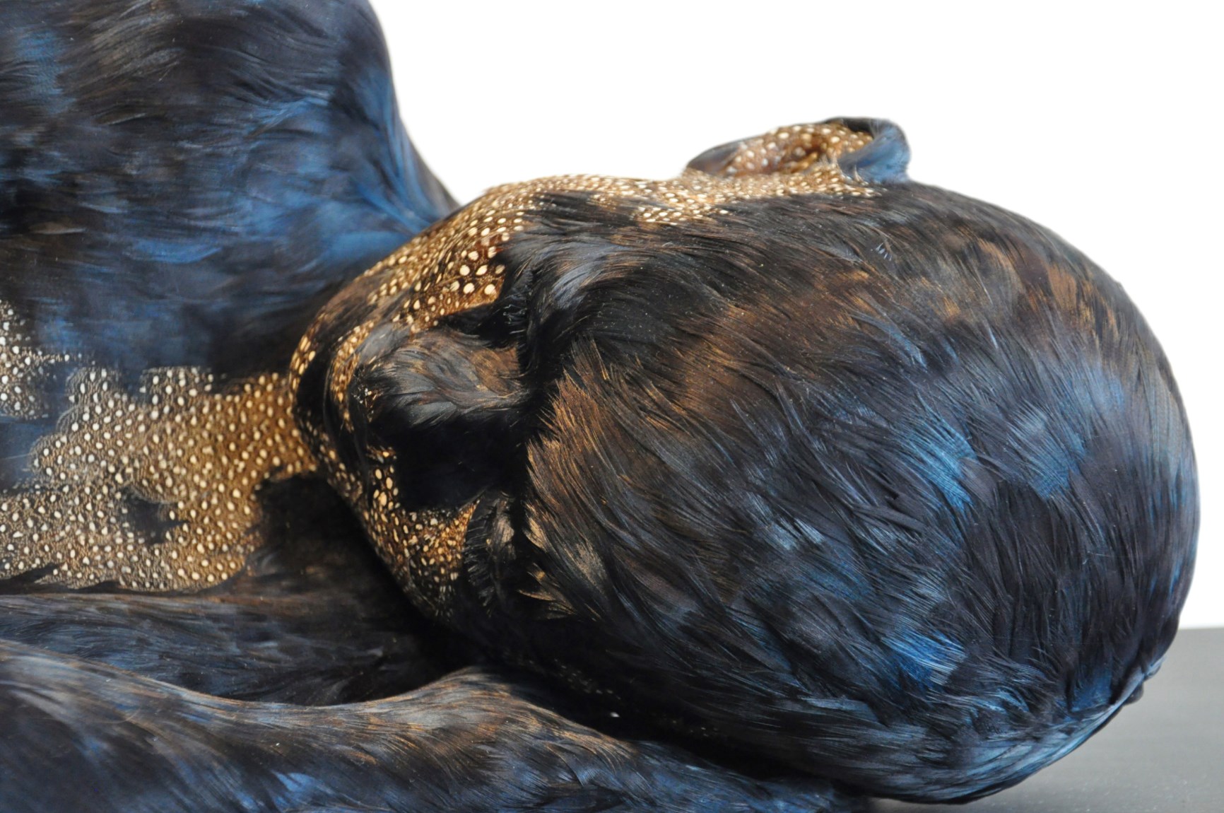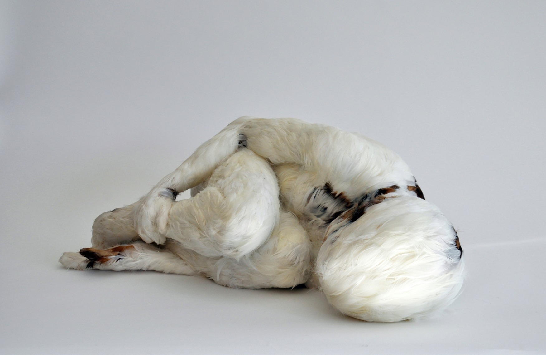 La serie “Feathered Children” è un’inchiesta su quale direzione potrebbe prendere l’umanità attraverso la manipolazione genetica. L’artista definisce le sue sculture delle domande ed è per questo che le vuole vulnerabili. Esse suscitano nello spettatore il bisogno di prendersene cura.